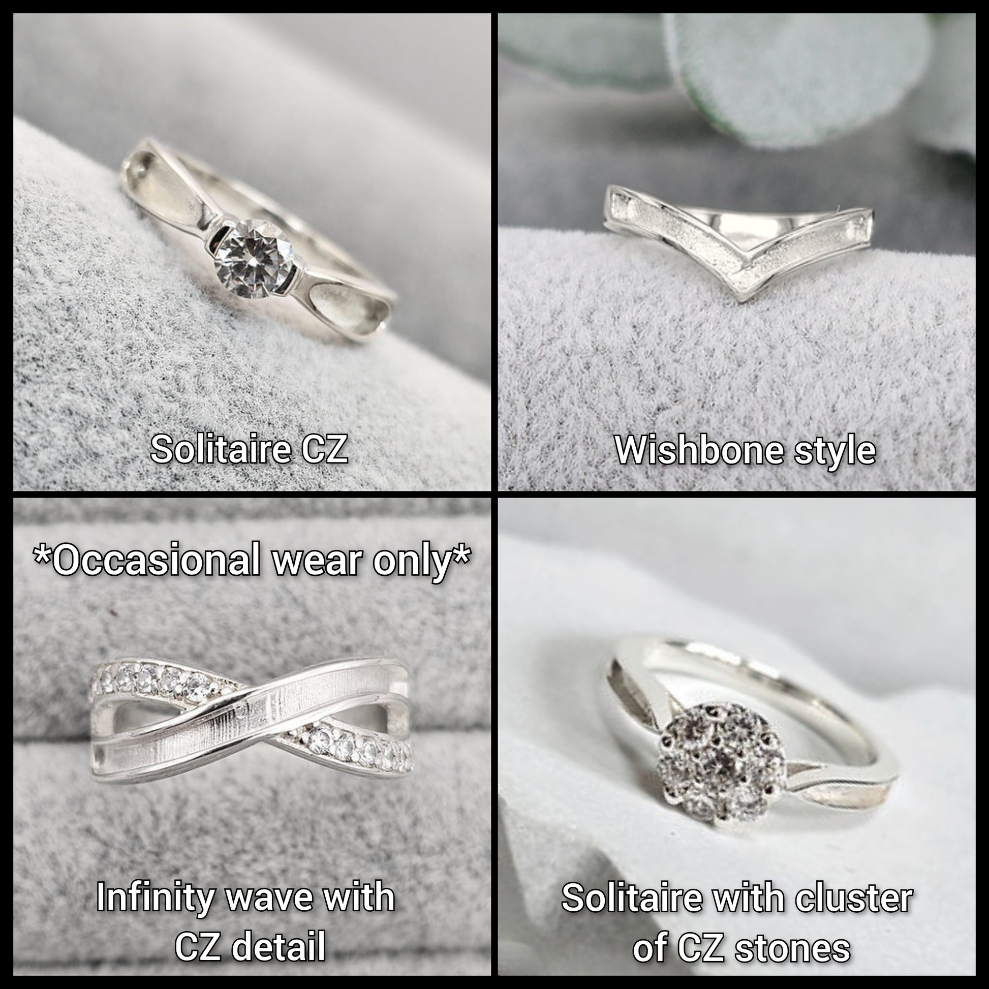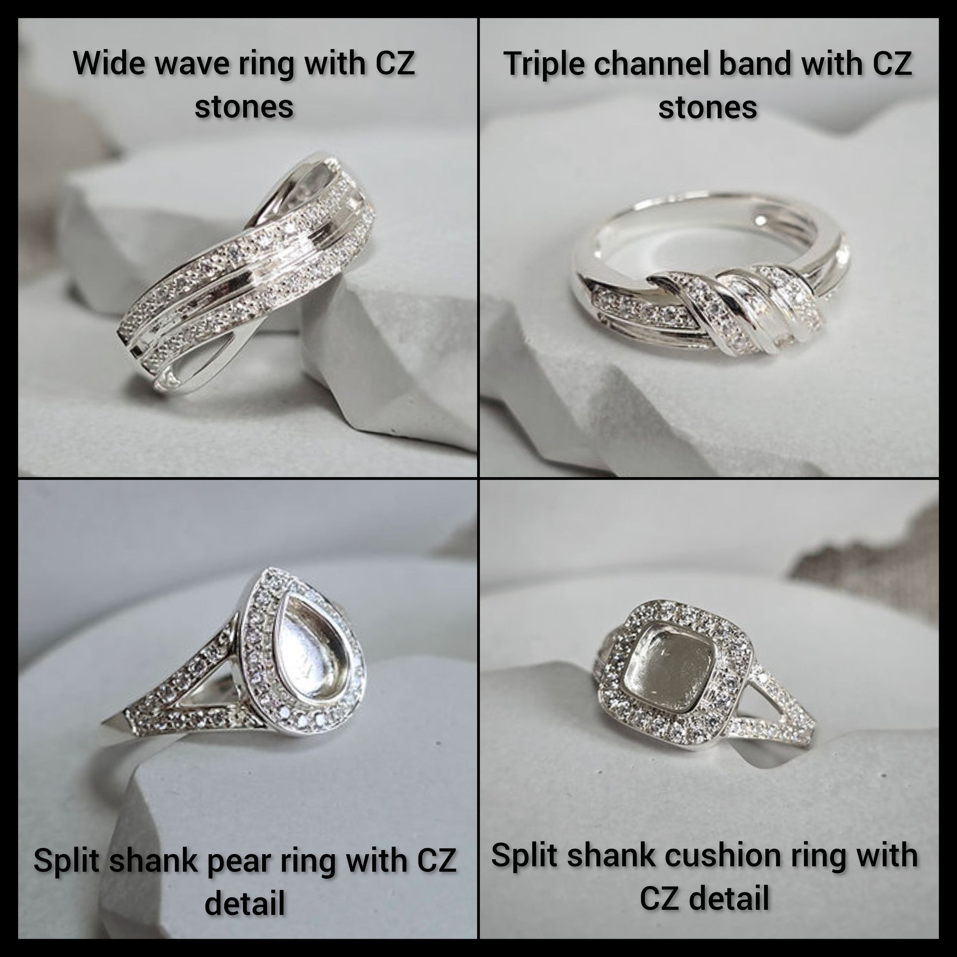 This collection of beautiful rings are made from 925 Sterling Silver or Argentium silver which is 1% purer than sterling and less likely to tarnish; please see individual pictures for specific size details. (All sizes are approximate and the rings with pave set stones are for occasional wear only). The Argentium silver rings can also be engraved, please message for further details.