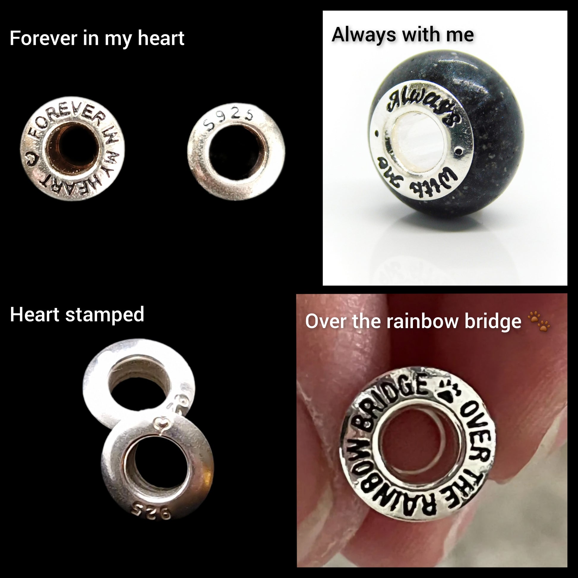 These keepsake beads are approximately 7x14mm and fit most popular style bracelets, including Pandora. There is a choice of four different style cores which can be fitted to the beads. The 925 sterling silver heart stamped core is glued onto the bead, the other 3 are solid silver and mechanically fitted full cores. They are handmade in the South of England to incorporate your loved ones ashes, hair and/or fur. There are a variety of different options available and I can make in a variety of colours, styles and effects so if there's something you had in mind that you don't see or anything more personal you would like to add, I'm happy to work with you to create your perfect piece. Regarding colours and effects please note they can vary and cannot be exactly replicated due to many factors including differences in screens and then again in person/natural light. Cremains themselves also vary greatly in colour and again can affect the overall colour/finish. This is one of the many reasons that make it so unique and special!